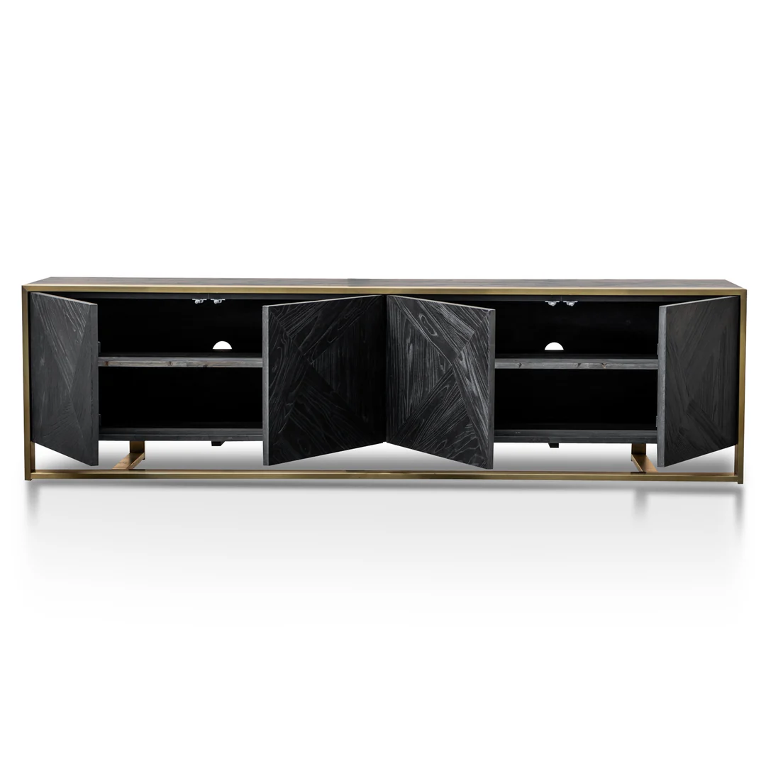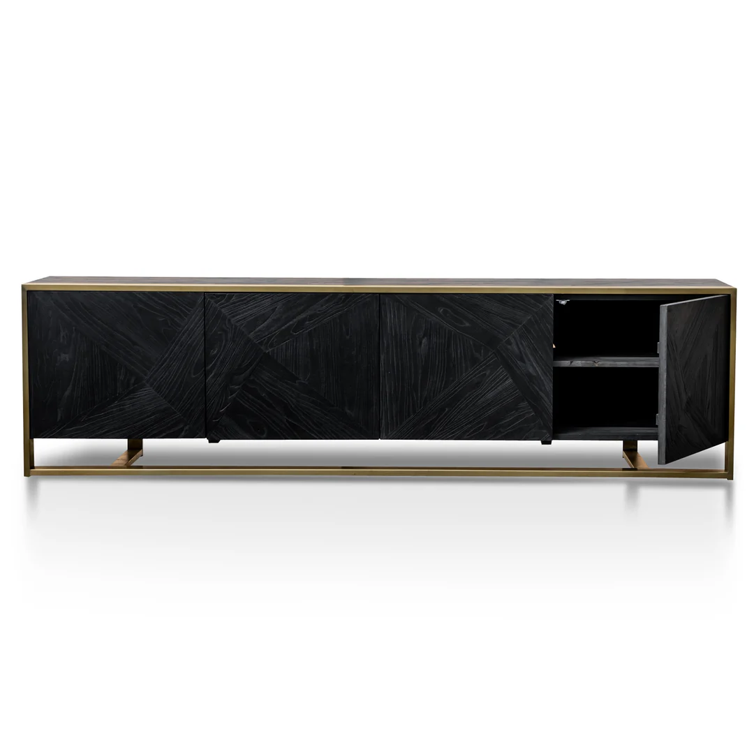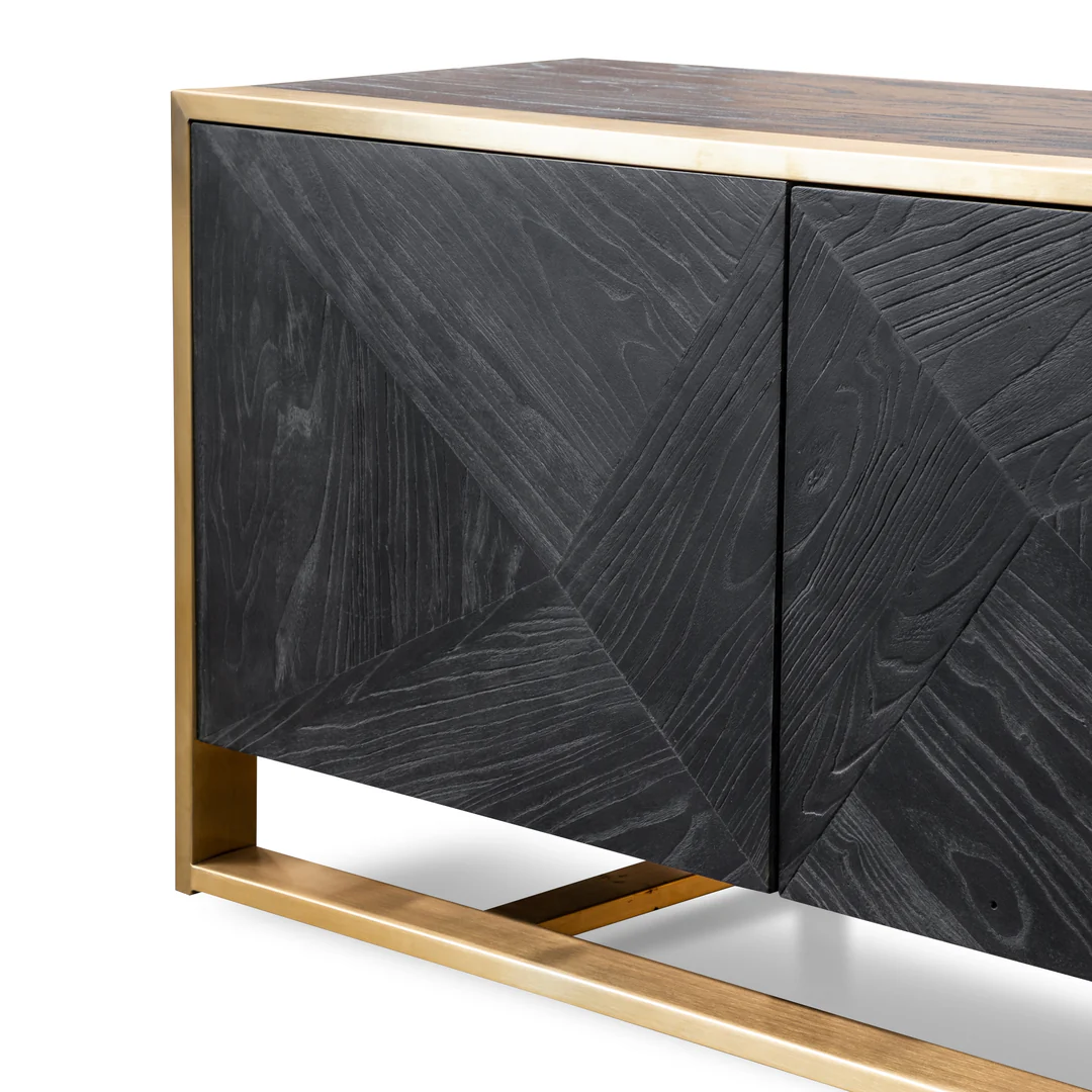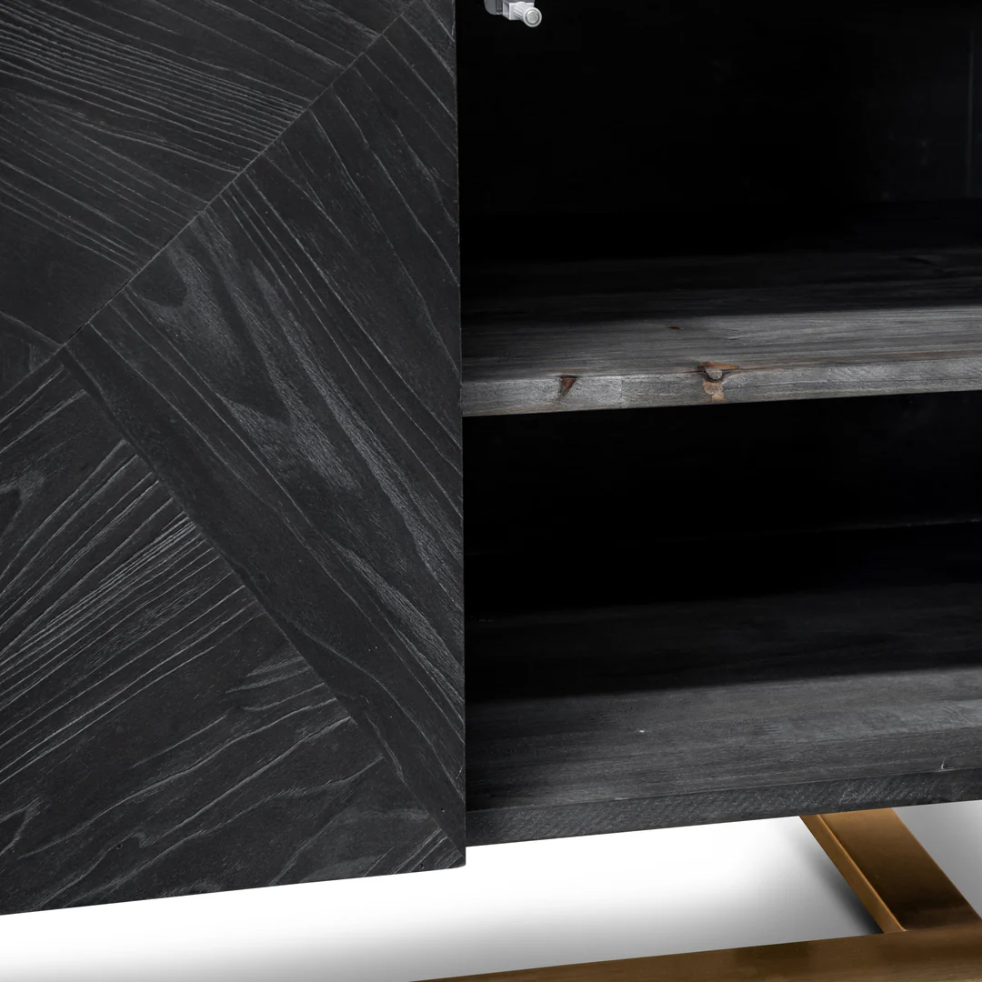 - Geometric carved doors in a weathered black finish