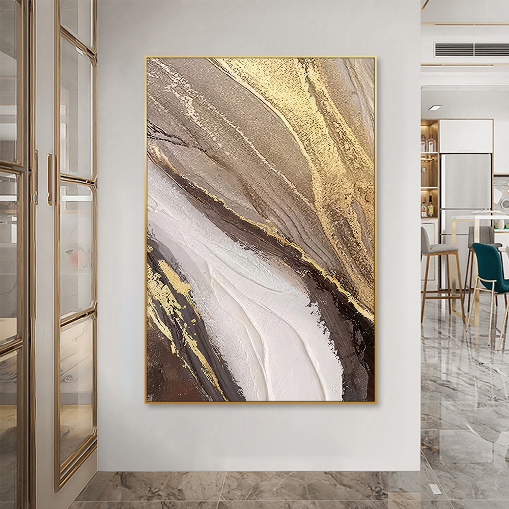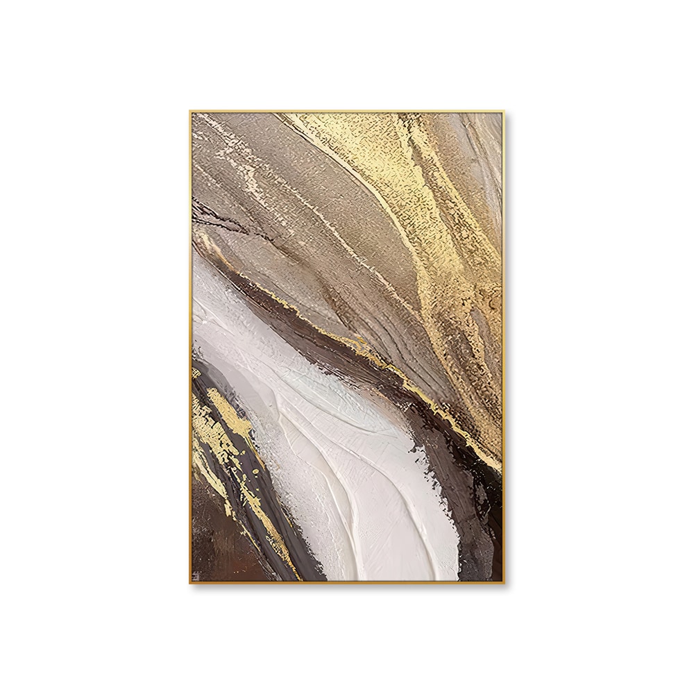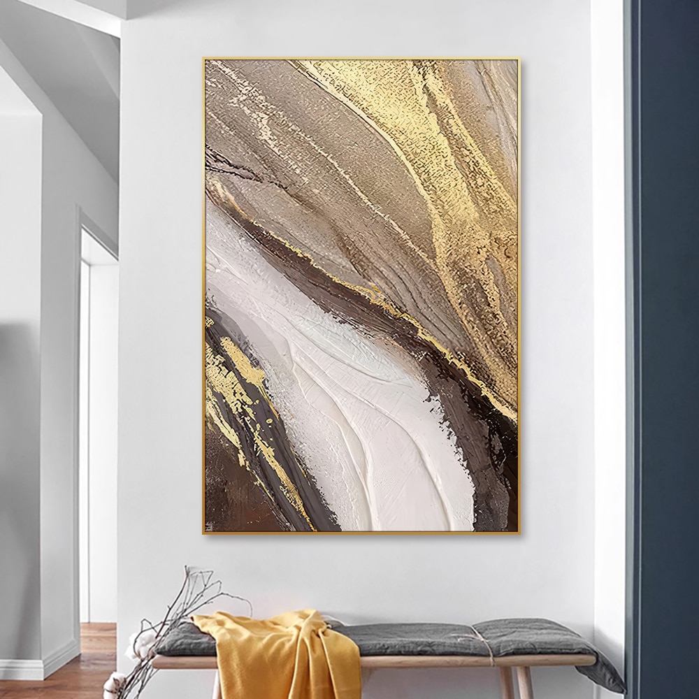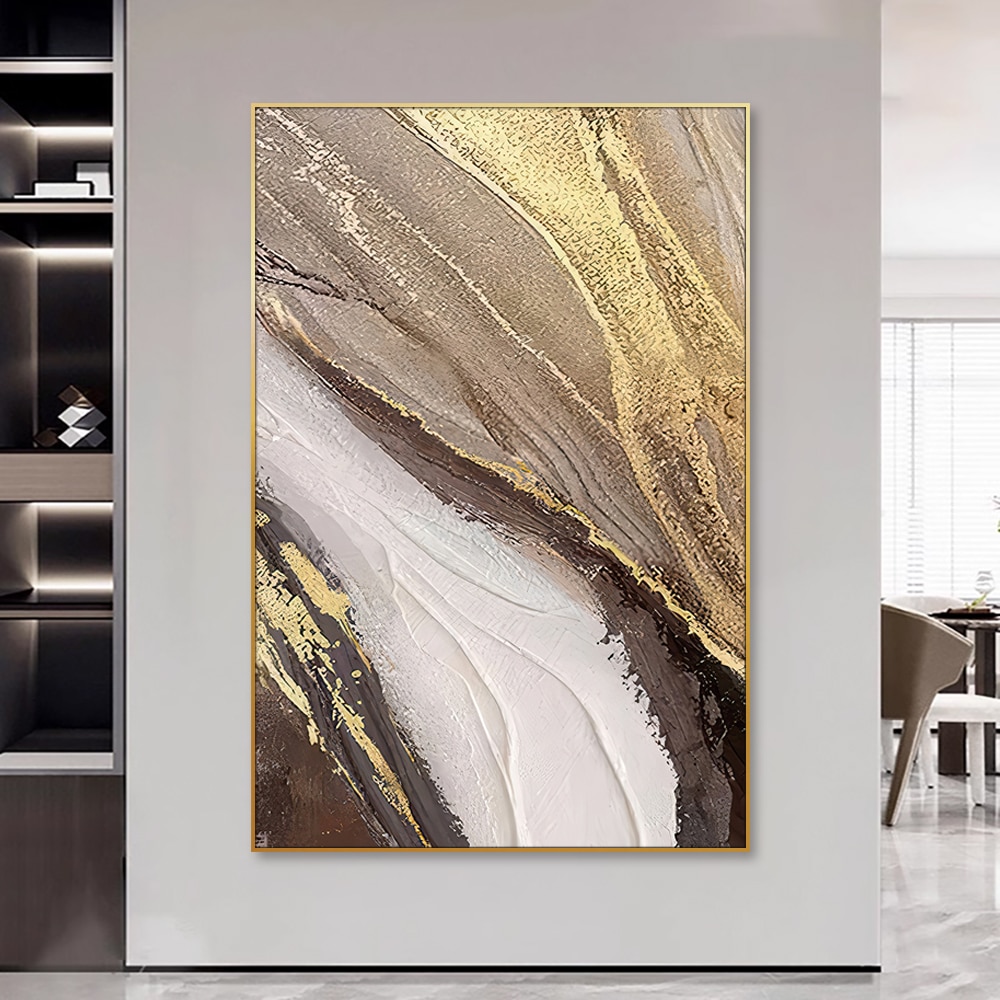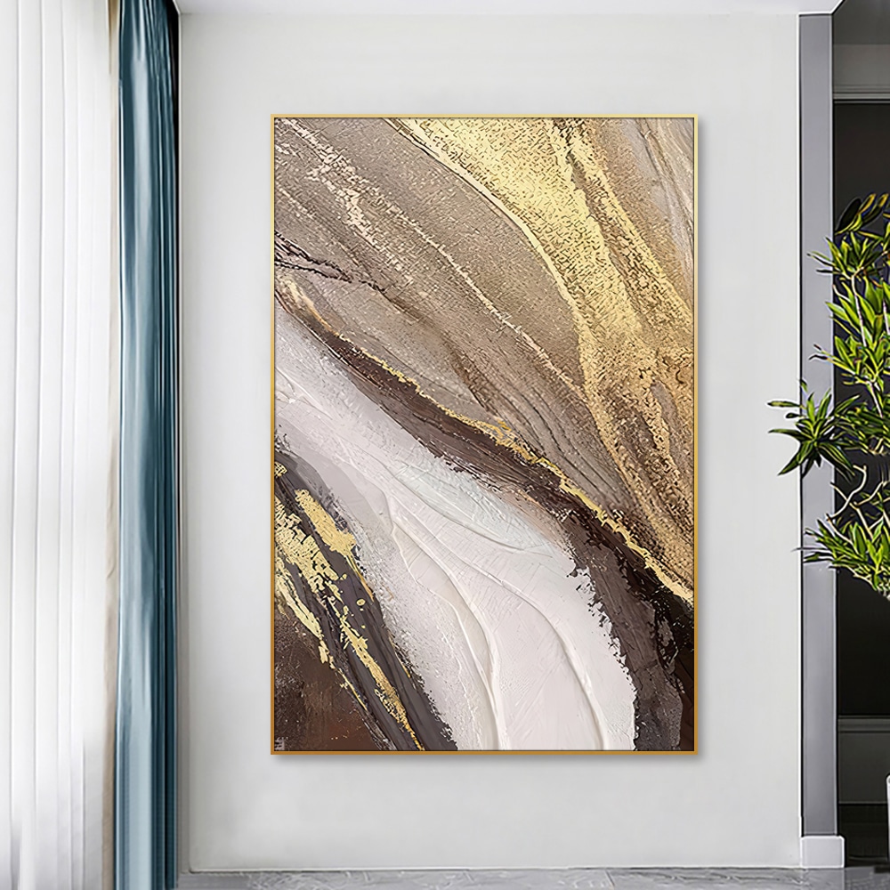 Bring movement and elegance into your space with this bold handmade abstract artwork. Featuring dynamic gold streaks against a palette of earthy neutrals and soft whites, this painting adds warmth and sophistication to any room. Its large vertical format makes it ideal for entryways, lounges, or dining rooms where a statement piece is needed.