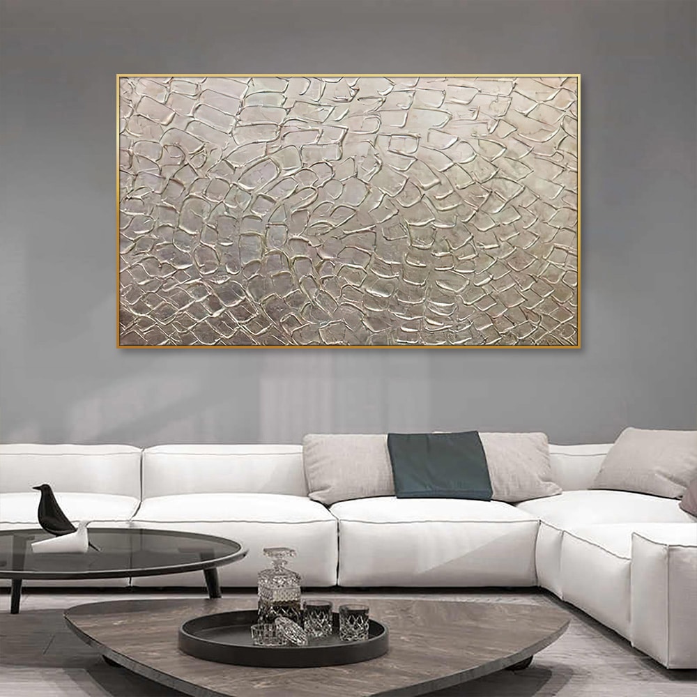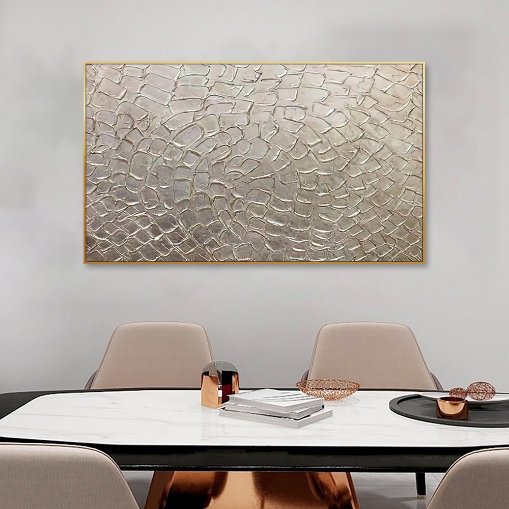 This striking large-format artwork blends metallic warmth with organic texture, making it a standout feature for dining rooms, lounges, or office walls. The hand-painted champagne gold pattern ripples across the surface like abstract scales, catching the light and creating subtle dimension. The oversized scale works beautifully above long consoles, modern sofas, or large dining settings.